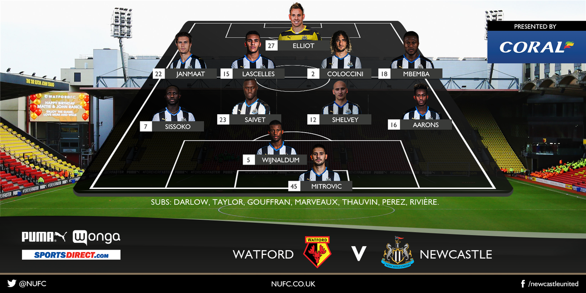 | Newcastle: Rob Elliot Daryl Janmaat Fabricio Coloccini © Jamaal Lascelles Chancel Mbemba Henri Saivet Jonjo Shelvey Moussa Sissoko Georginio Wijnaldum Rolando Aarons Aleksandar Mitrović Rezerwowi: Karl Darlow Steven Taylor Yoan Gouffran Florian Thauvin Sylvain Marveaux Ayoze Perez Emmanuel Riviere | Watford: Heurelho Gomes Juan Carolos Paredes Miguel Britos Craig Cathcart Nathan Ake Etienne Capoue Ben Watson Valon Behrami Troy Deeney © Jose Manuel Jurado Odion Ighalo Rezerwowi: Costel Pantilimon Allan Nyom Sebastian Prödl Ikechi Anya Adlene Guedioura Almen Abdi Nordin Amrabat |